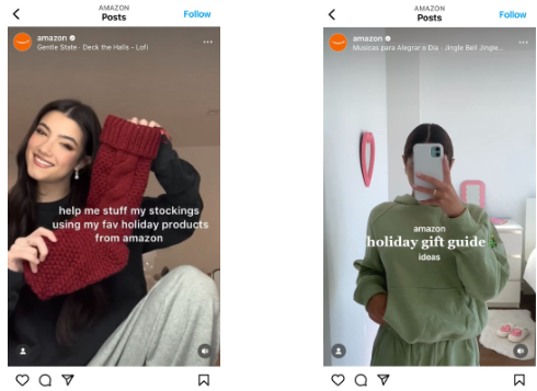 On Instagram, Amazon partners with popular public figures, such as famous TikToker, Charli D’Amelio (left) and Sonya (@activecactus) (right), as pictured below. These figures receive products from Amazon, film themselves using them and get paid to promote their products.