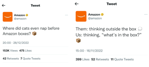 On Twitter, Amazon takes a more humorous approach, using their iconic ‘smile’ boxes as the basis for memes and funny tweets like the ones below: