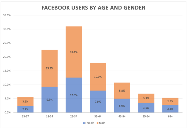 With 2.934 billion users (as of July 2022), Facebook is the most used social network site across the board. However, the way in which these demographics are broken down will tell you whether you should be using Facebook as a predominant marketing platform or not. Here is a chart illustrating the demographic breakdown of Facebook’s users:
